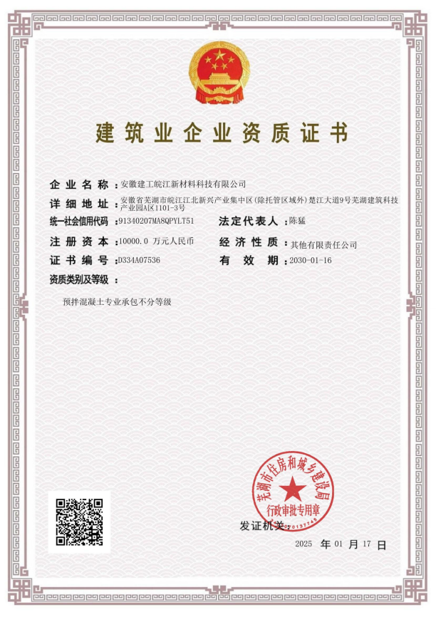 喜報(bào)!安徽建工皖江新材料科技有限公司取得預(yù)拌混凝土專業(yè)承包資質(zhì)