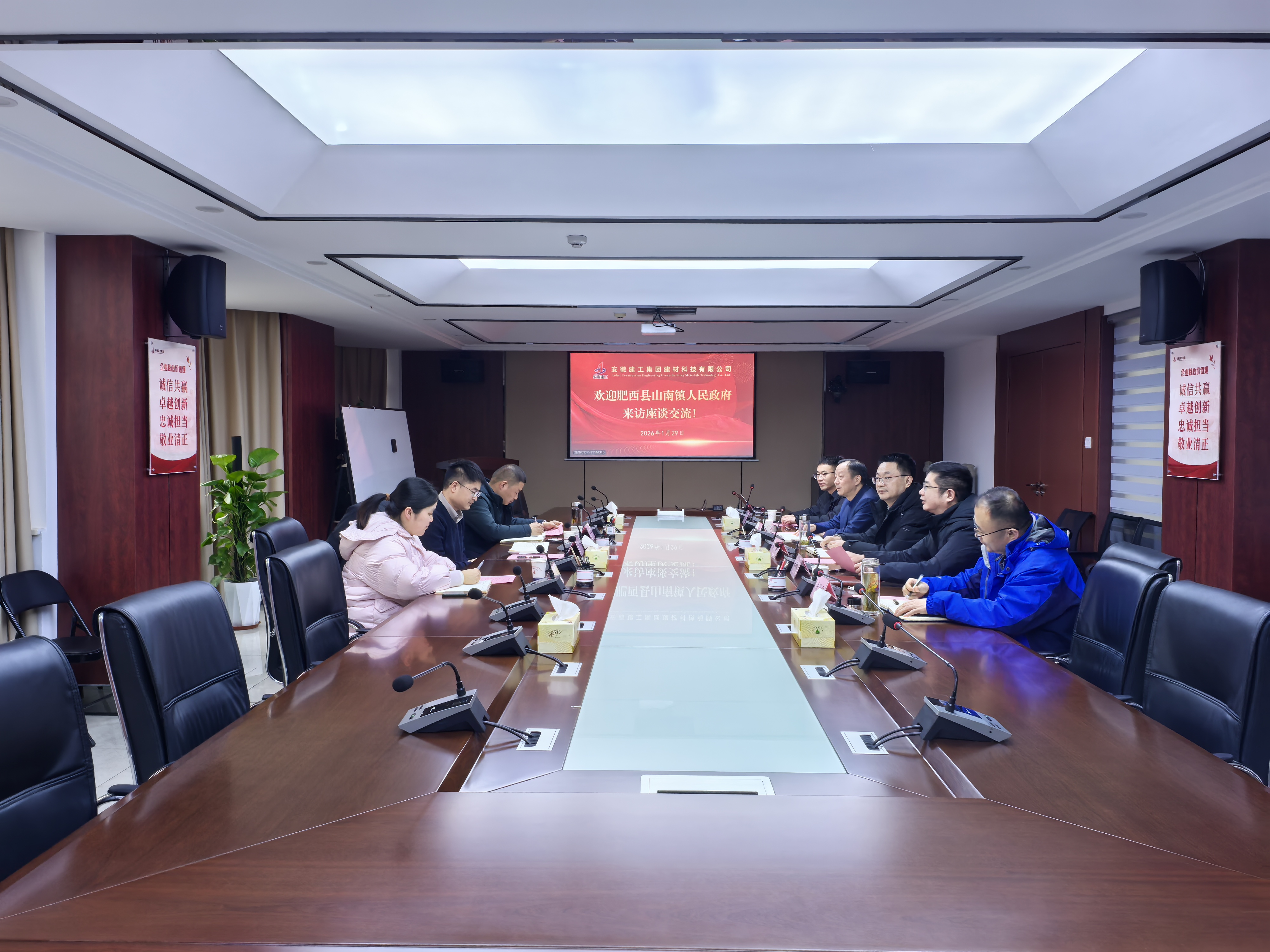 肥西縣山南鎮(zhèn)人大主席王磊、經(jīng)發(fā)辦主任郭惠,建工建材黨委委員、副總經(jīng)理朱明歡,雙方有關(guān)單位和部門負(fù)責(zé)同志參加會(huì)談。